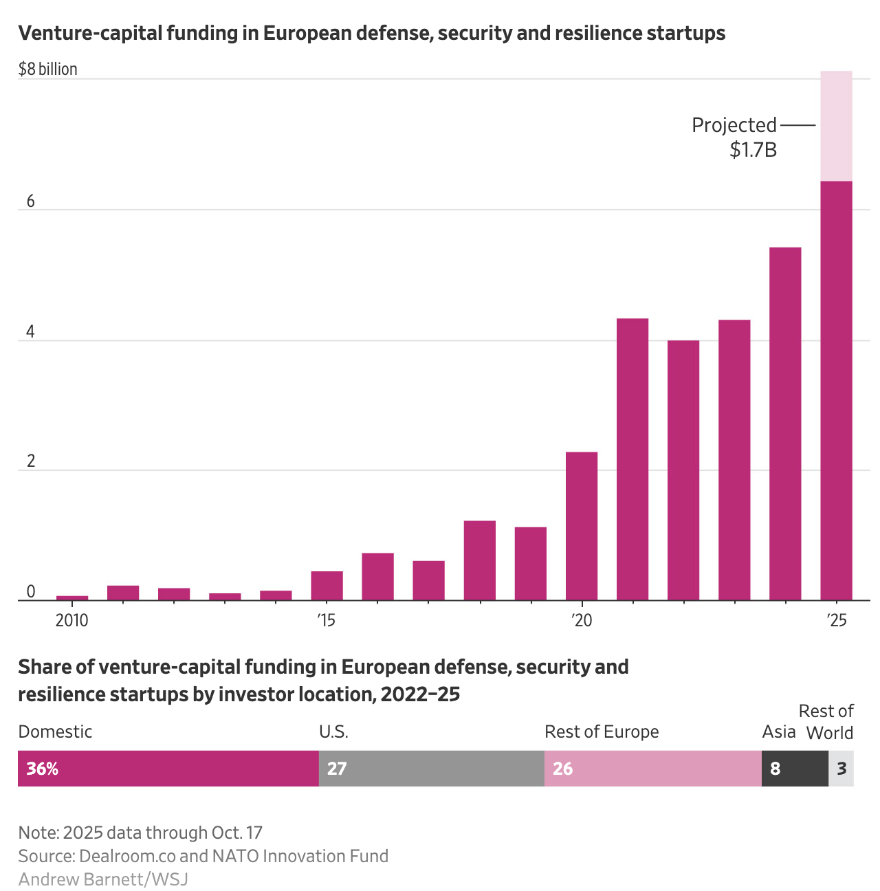 🛰️🔫 Military Tech Companies, Long Snubbed in Europe, Are Having a Moment (The Wall Street Journal, 23 octobre 2025)